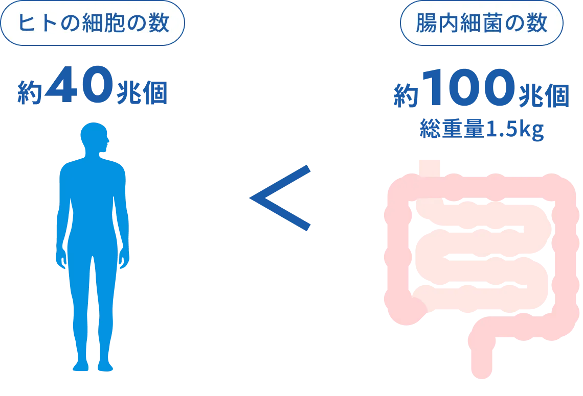 人の腸内には、約1,000種、100兆個にも及ぶ腸内細菌が棲んでおり(腸内細菌叢と呼ばれています)、ヒトの細胞数(約40兆個)を上回るともいわれています。近年、この腸内細菌叢が腸内環境だけでなく、全身の健康に深く関わっていることが明らかになっています。
