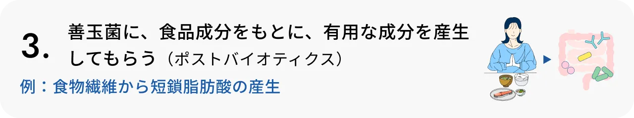 - 生きた善玉菌そのものを摂取すること。 腸内フローラを整え、便通や免疫機能をサポートします。