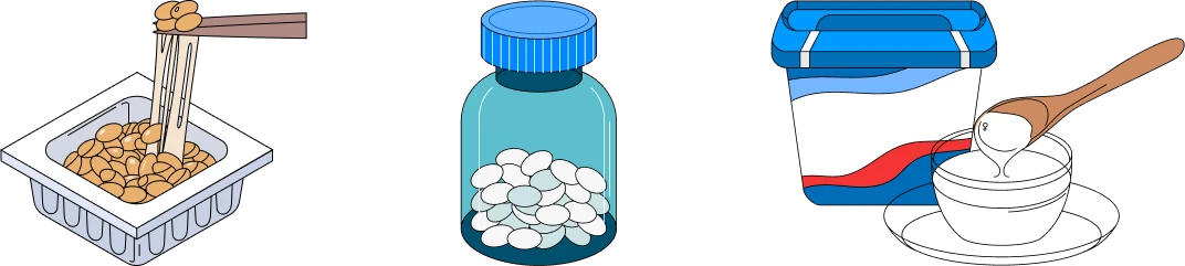 味噌、納豆、ぬかづけ、ヨーグルトなど日本の食生活に根付いている発酵食品に多く含まれており、食事などを通じて摂取したプロバイオティクスは腸まで届いて善玉菌を増やし、腸内環境を整えます。