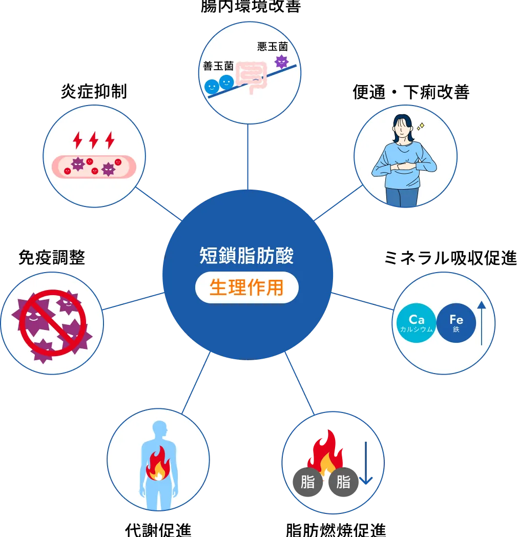 短鎖脂肪酸は、腸内細菌が発酵性食物繊維をエサとして食べたときに作られる代謝物です。この短鎖脂肪酸は、「腸内環境を整える」「排便を促す」などの腸の健康に役立つ働きをするだけでなく、免疫調節や炎症抑制、代謝促進、太りにくくするなど、体全体の健康維持に関与していることもわかっています。